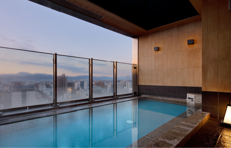 顶层的天空露天浴池中,从女浴场可眺望到松山城,从男浴场则可欣赏到夕阳美景。